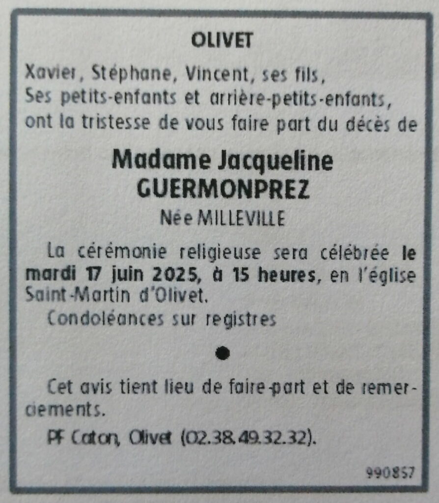 ✝️ Nous célébrerons ses obsèques mardi 17 juin à 15h00, dans l’église Saint-Martin d’Olivet (696 rue du Général de Gaulle, 45160 OLIVET). N’hésitez pas à venir nous entourer !