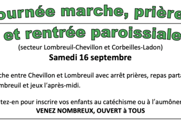 marche entre Chevillon et Lombreuil avec arrêts prières, repas partagé à Lombreuil et jeux l’après-midi pour le secteur Lombreuil -Chevillon et Corbeilles-Ladon Profitez-en pour inscrire vos enfants au catéchisme ou à l’aumônerie Venez nombreux ouvert à tous !
