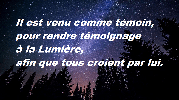 Il y eut un homme envoyé par Dieu; son nom était Jean. Il est venu comme témoin, pour rendre témoignage à la Lumière, afin que tous croient par lui. Cet homme n’était pas la Lumière, mais il était là pour rendre témoignage à la Lumière.